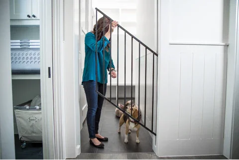 This gate setup is pretty versatile and because of its design can be added to existing homes, or incorporated into new builds, as long as there's no plumbing, HVAC, or wiring in the way.