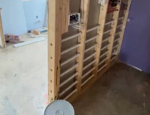 At this point in our build, we had already drywalled which was slightly problematic. In order to complete this install it did require removing a section of drywall where the bars are installed. The builder removed the drywall panel, drilled some holes through the framing, and installed PVC for stability without messing with the electric or plumbing. They then contacted a welder who fabricated steel bars that we slid into the PVC support channels in the framing. These rods were mounted to a steel plate that we fastened to a piece of wood that matched our trim.